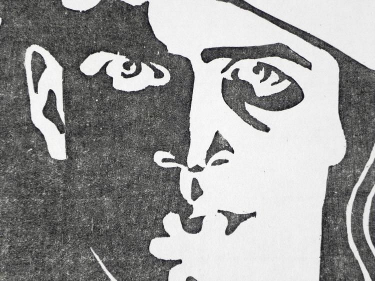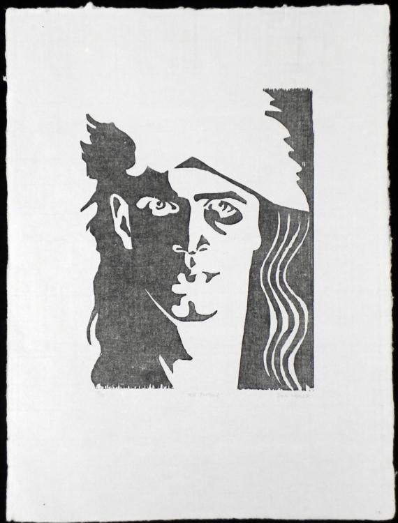 Don appears to be showing off his light and dark side to his artistic personality. Artist: Don WeaverTitle: Self Portrait Medium: Block print on paper Edition: Limited out of 10 Image Size: 10 1/4" x 13" Paper Size: 17" x 22" Condition: Very Good, uneven edges These are some of the original pieces that Don offered too potential clients, as part of his portfolio. Most of them were done in the earlier years of his life. Don Weaver has over 20 years of experience in advertising, marketing, and graphics; he has the experience and ability to communicate your message in a creative, effective, and memorable way. Most recently, he spent six years as the Advertising Creative Manager (and Graphics Manager) with The Tampa Tribune. Previous positions included creative director and art director for agencies in Phoenix and Memphis, production manager for a major printing company, and marketing director for an international nutritional supplement company. In addition to creative strategy development and graphic design, he has extensive experience in broadcast, video, and digital media production. Don originally started out as a photographer, but soon realized that he was even stronger in design and writing. That photographic background still gives Don a unique perspective that translates into his design style.