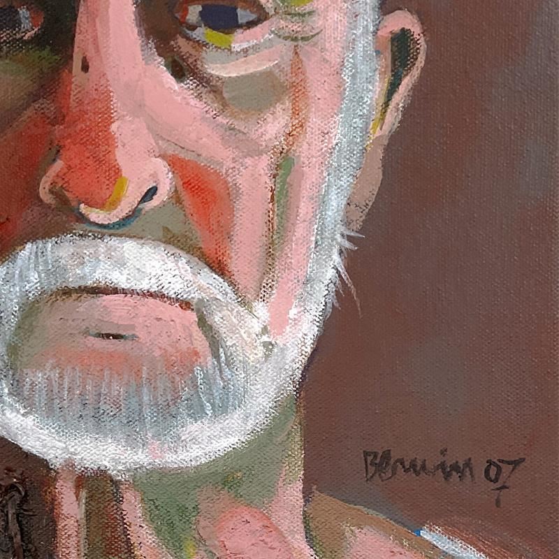 "Self Portrait" is an original painting on stretched canvas by Milton Berwin (1925-2023), hand signed by the artist. Includes Letter of Authenticity. Measures approx. 14" x 12" (image). There is a minor smudge on the bottom-left edge of the canvas; this imperfection may be concealed when framed.