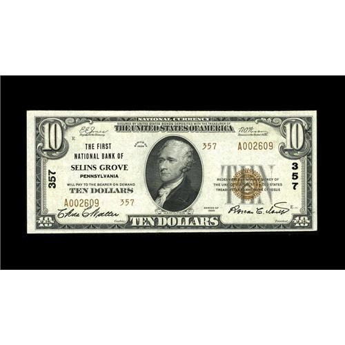 <B>Selins Grove, PA</B></I> - $10 1929 Ty. 2 <B>The First NB</B></I> Ch. # 357<BR>This addition to the census makes three of the $10 Ty. 2 now verified from here. This is the nicest of that exclusive group, grading <B>Choice Crisp Uncirculated,</B></I> although an as made paper wrinkle is noted. The embossing is as deep as the day this note was printed and it presents with all the eye appeal it had on the very day it was printed. Pennsylvania specialists will especially appreciate this item.<BR><BR><b>Shipping:</b> Coin/Currency (<a target="_blank" href="http://www.heritageauctions.com/common/shipping.php">view shipping information</a>)