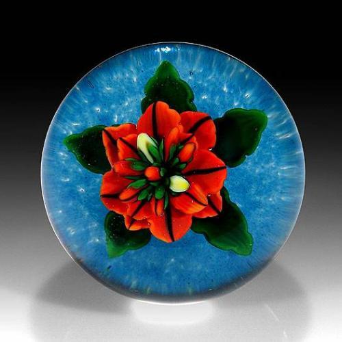 Selkirk Glass 1981 "Poinsettia" red flower paperweight, by Peter Holmes. A three-dimensional red poinsettia blooms over translucent blue ground. Signed/dated. "PH" signature cane on the underside. Edition #16 of a limited edition of 75. Diameter 2 7/8".