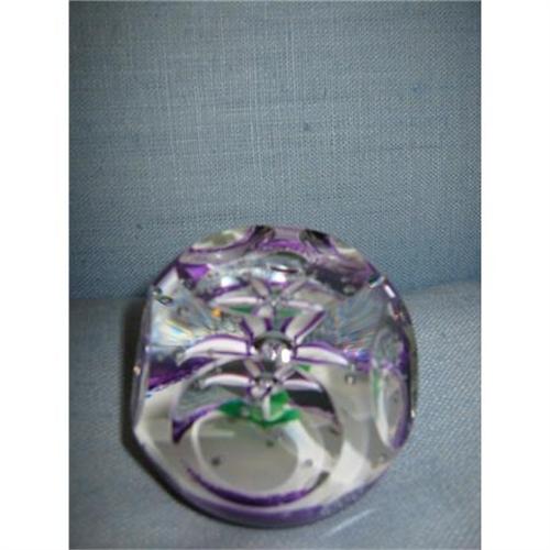 stunning studio art glass by "Selkirk Glass 'of Scotland. it is hand made , hand signed w gold label. sign reads selkirk glass scotland romance 2001 and the label reads: selkirk glass hand made in scotland with selkirk emblem on the top. the beautiful lavender with white flower and green leaves along w attractive bubbles. geometric style with 6 round cuts. in excellent condition. never been used. 2.5 " T. - 3 " in diam. base is glass lavender and is collector's prize.