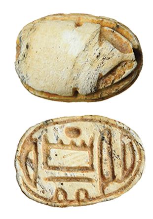 Sello de Amón. Fayenza. Último Periodo. Dinastía XVIII-XXVI (1569-525 a.C.). Base grabada con el nombre del dios Amón-Ra. Longitud 1,0 cm.