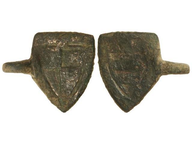 Sello de documento. - S. XIII-XIV. - Anv.: Escudo cuartelado, dos cuarteles incusos. Rev.: Escudo con seis franjas horizontales, tres incusas. AE. Ø 30x33 mm. Con anilla. MBC. - -