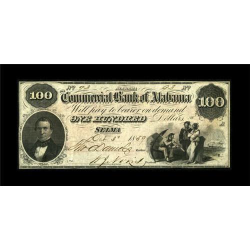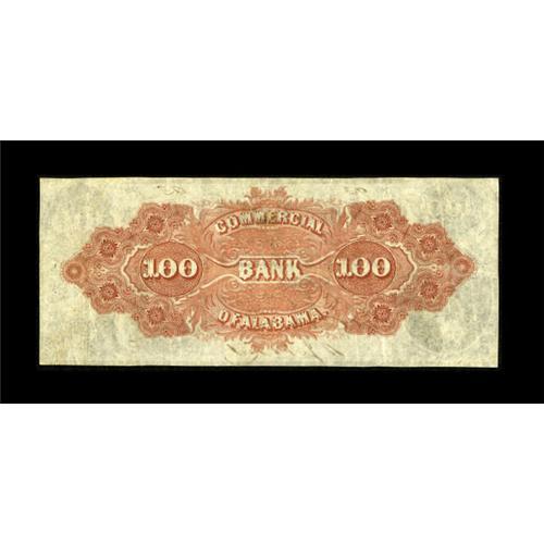 <B>Selma, AL- Commercial Bank of Alabama</B></I> $100 Oct. 3, 1859 G16b Rosene 294-7<BR> A scarce note, particularly in this state of preservation. Bright <B>Very Fine, </B></I>with a vivid orange reverse. <BR><BR><b>Shipping:</b> Coins & Currency (<a target="_blank" href="http://www.heritageauctions.com/common/shipping.php">view shipping information</a>)