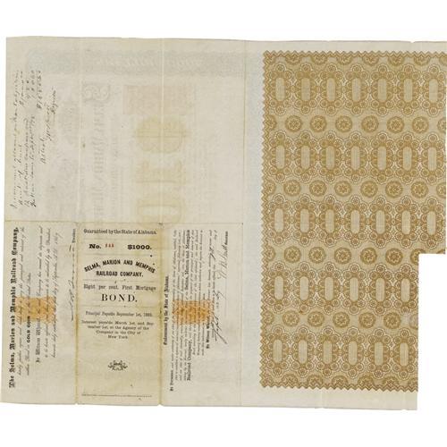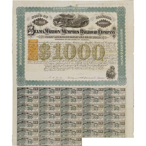 <B>Selma, AL- Selma, Marion and Memphis Railroad Company</B></I> $1000 Bond 1868<BR>This colorful bond has the signature of N(athan) B(edford) Forrest, former Confederate Lt. General of cavalry, on both the face and back. Forrest had much success during the war with his daring raids and tactics. However, this railroad went bankrupt under his leadership. This bond was not mounted. <B>Very Fine.</B></I><BR><I>From The William A. "Bill" Bond Collection</B></I><BR><BR><b>Shipping:</b> Coins & Currency (<a target="_blank" href="http://www.heritageauctions.com/common/shipping.php">view shipping information</a>)
