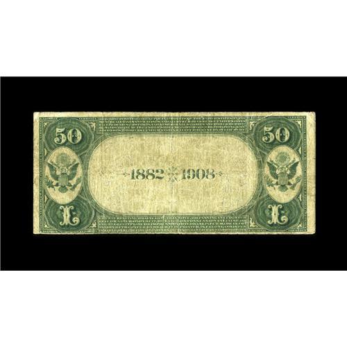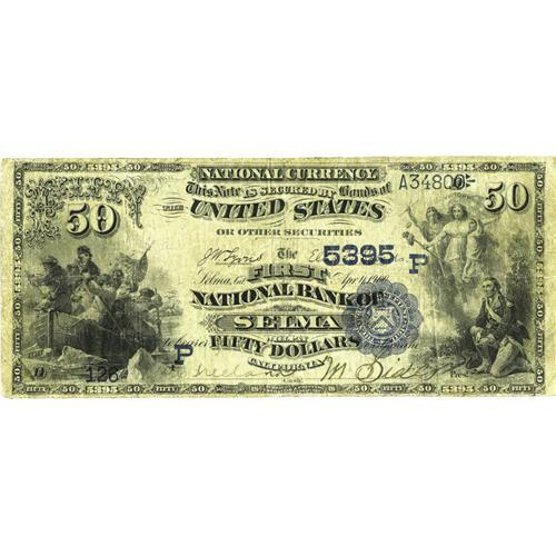 <B>Selma, CA</B></I> - $50 1882 Date Back Fr. 563 <B>The First NB</B></I> Ch. # (P)5395<BR>Seven notes are known from this rare Fresno County bank, with six being high denomination Second Charters, four fifties and two hundreds. This <B>Fine</B></I> example carries nice pen signatures.