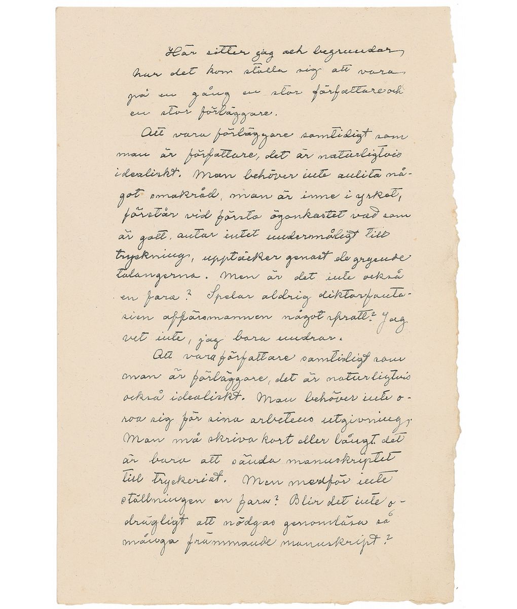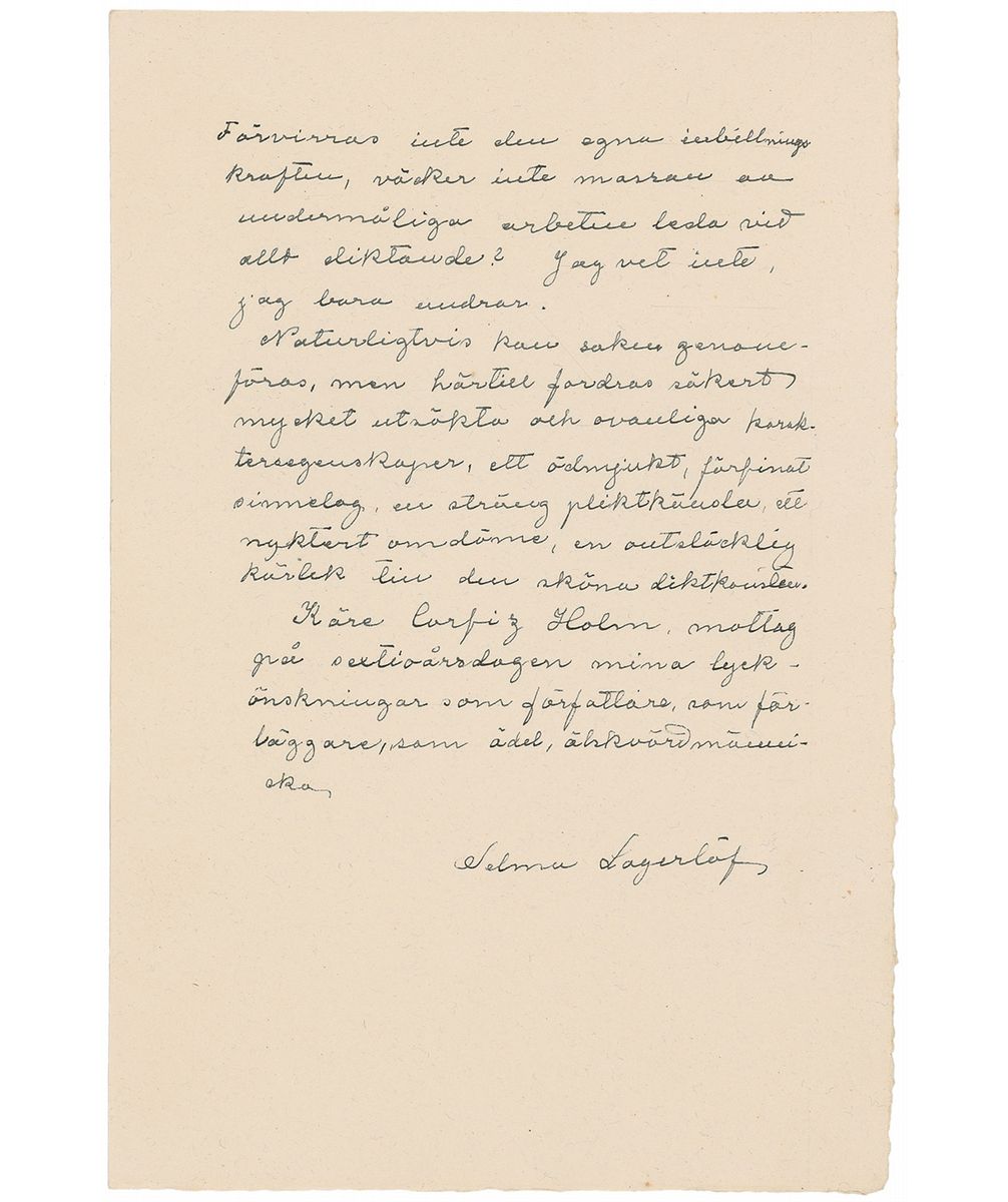 Swedish writer (1858–1940) who in 1909 became the first woman to win the Nobel Prize for Literature. An untranslated autograph manuscript in Swedish, signed at the conclusion, two pages, 7 x 10.5, no date but circa August 1932. Lagerlorf pens a piece in honor of the birthday of German writer and publisher Korfiz Holm. In fine condition.
