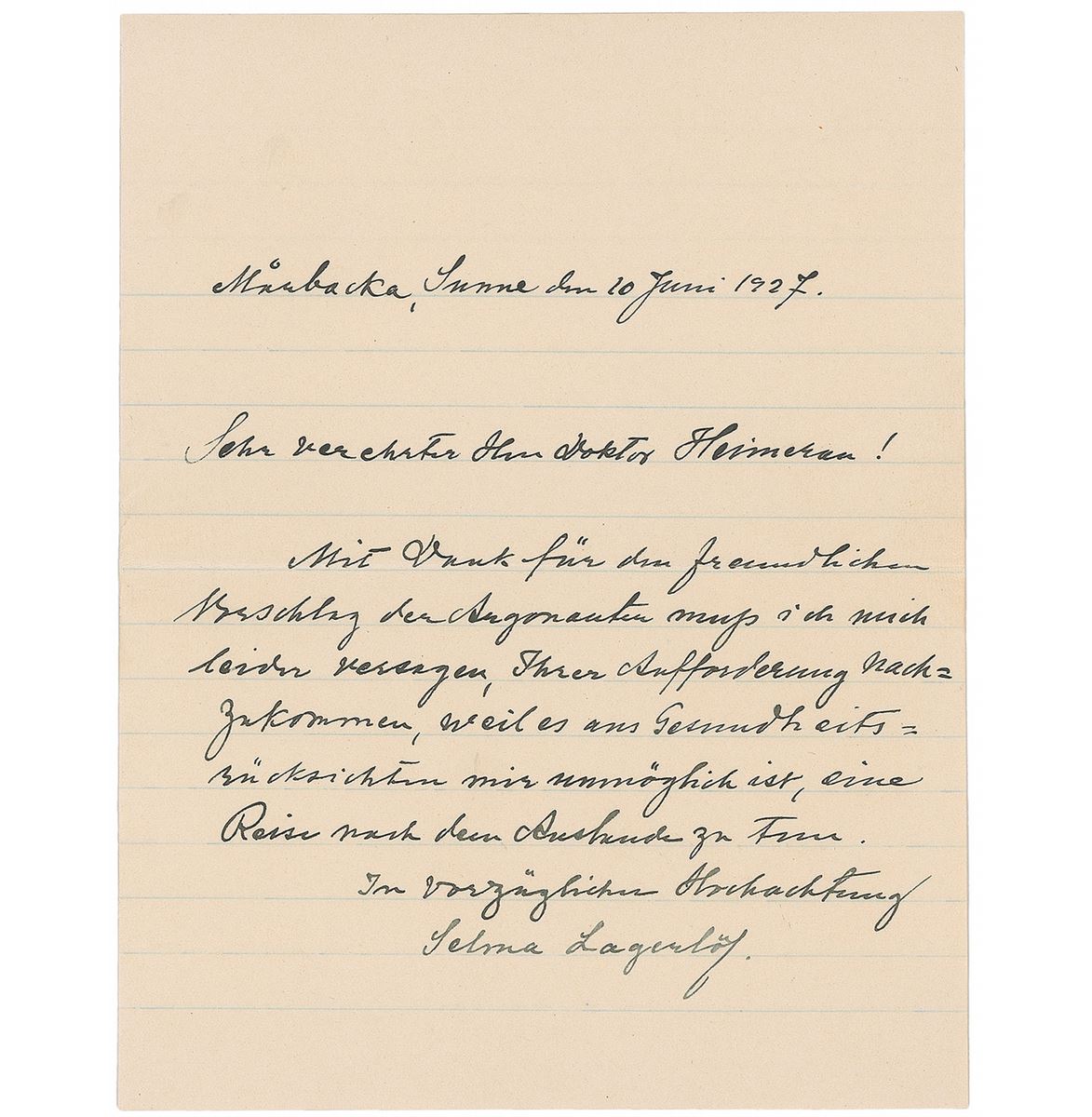 ALS in German, one page, lightly-lined, 5.5 x 7, June 10, 1927. Letter to Ernst Heimeran, in part (translated): "I must unfortunately fail to comply with your request because it is impossible for me for reasons of health to do a trip to foreign countries." In fine condition, with signature just a shade light. Accompanied by the original mailing envelope, addressed in his own hand.