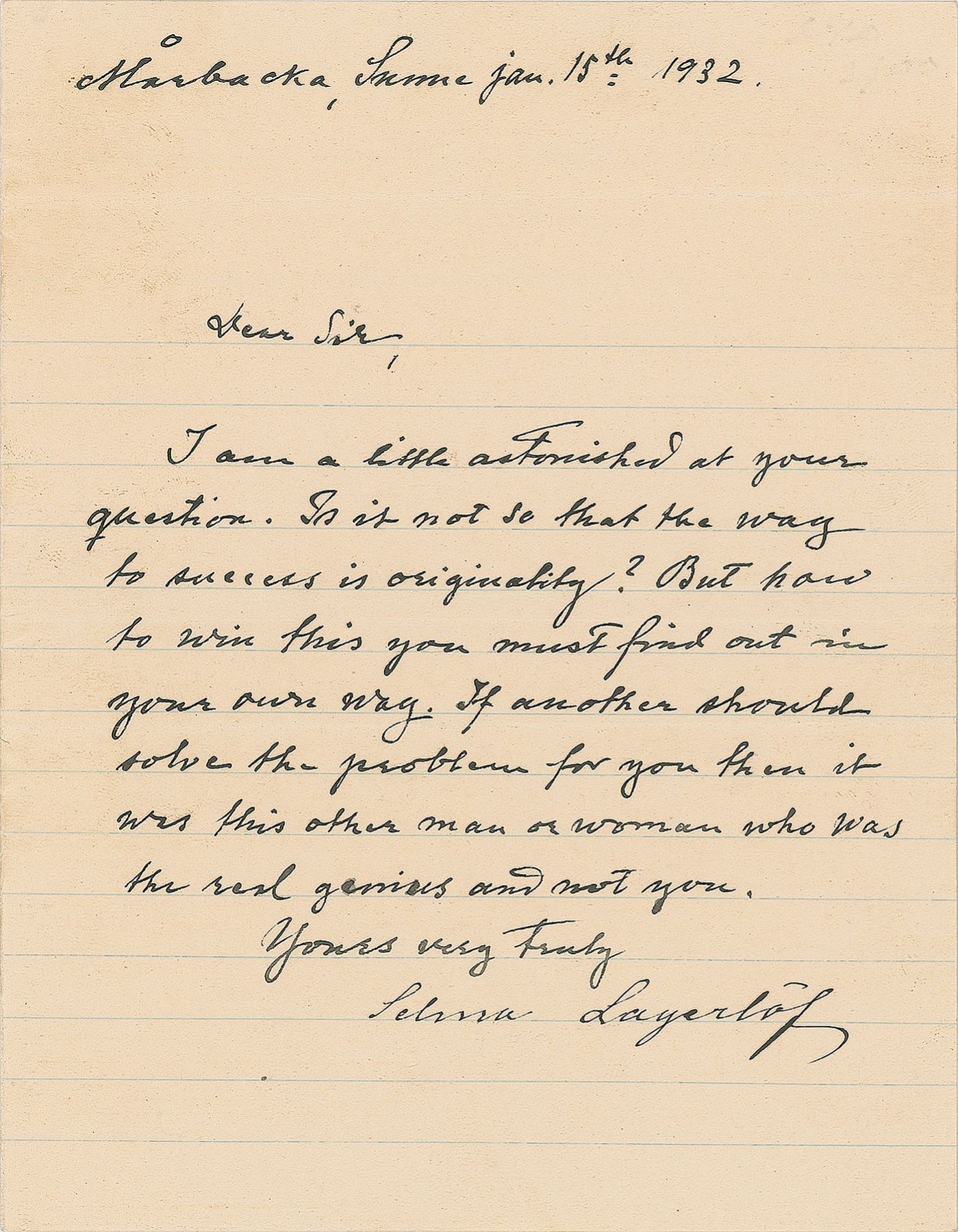 Swedish writer (1858–1940) who, in 1909, became the first woman to win the Nobel Prize for Literature. ALS, one page, 5.5 x 7, January 15, 1932. Lagerlof writes from her Marbacka home in Sunne, in full: "I am a little astonished at your question. Is it not so that the way to success is originality? But how to win this you must find out in your own way. If another should solve the problem for you then it was this other man or woman who was the real genius and not you." In fine condition.