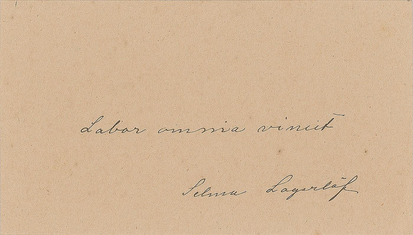 Swedish writer (1858-1940) who, in 1909, became the first woman to win the Nobel Prize for Literature. Scarce ink signature, "Labor omnia vincit [Work conquers all], Selma Lagerlof,” on an off-white 5.25 x 3 card. In fine condition. Accompanied by the original mailing envelope, postmarked September 28, 1923.