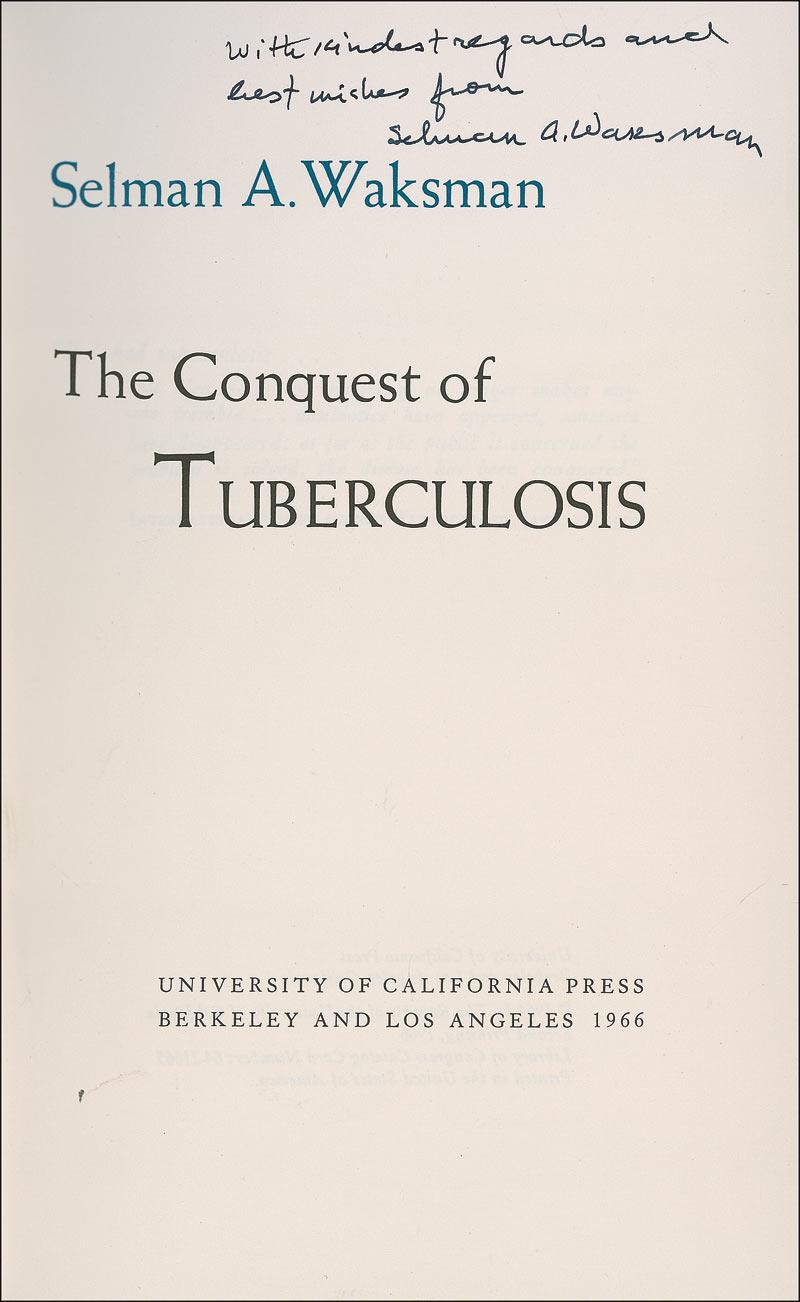 Awarded the 1952 Nobel Prize in Medicine in recognition for his discovery of streptomycin, the first antibiotic effective against tuberculosis. Signed book: The Conquest of Tuberculosis. Later printing. California: University of California Press, 1966. Hardcover with dustjacket, 5.75 x 8.75, 241 pages. Signed on the title page, “With kindest regards and best wishes, Selman A. Waksman.” In fine condition, with a bit of mild wear and toning to dustjacket.