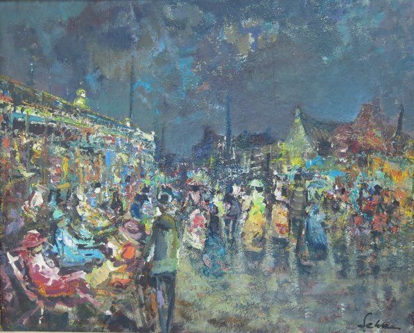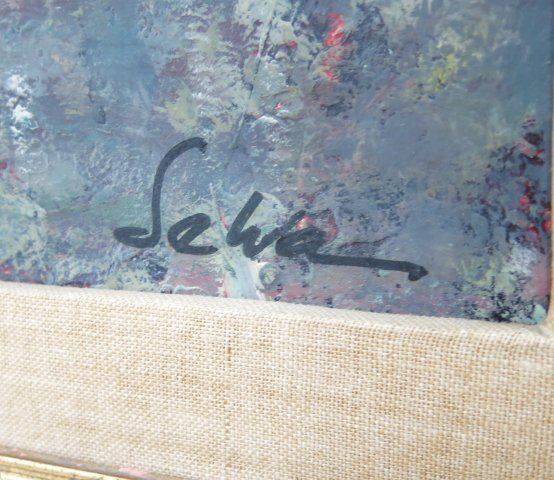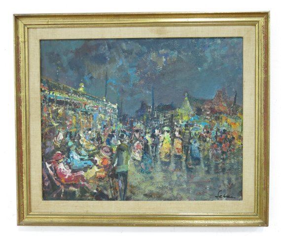 Oil on board. Signed lower right. Approx. 18" H x 23" W sight, 24" H x 29" W framed.