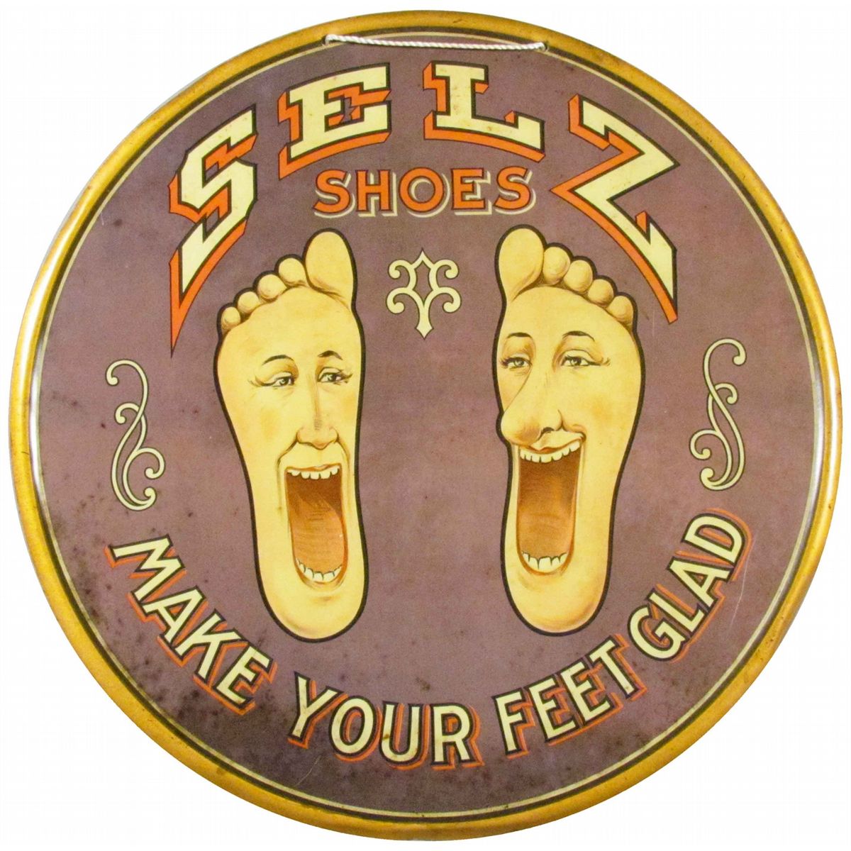 Selz Shoes Self Framed Tin String Hanger Sign. Entitled, "Make your feet Glad". Some very minor age discoloration otherwise excellent condition. 11 1/2 inch diameter.