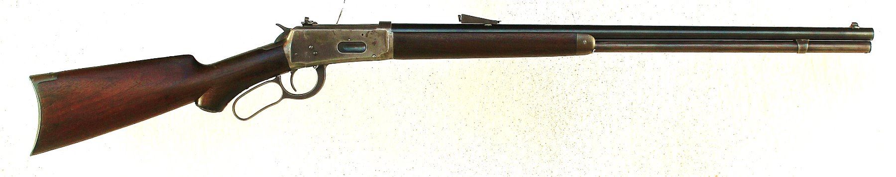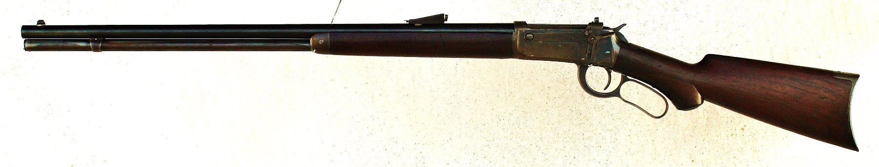 Great looking pistol gripped 1894 rifle with 26" round barrel, full magazine, and climbing Lyman sight. Metal showing much original bright blue finish and well fitting wood with deep attractive color.