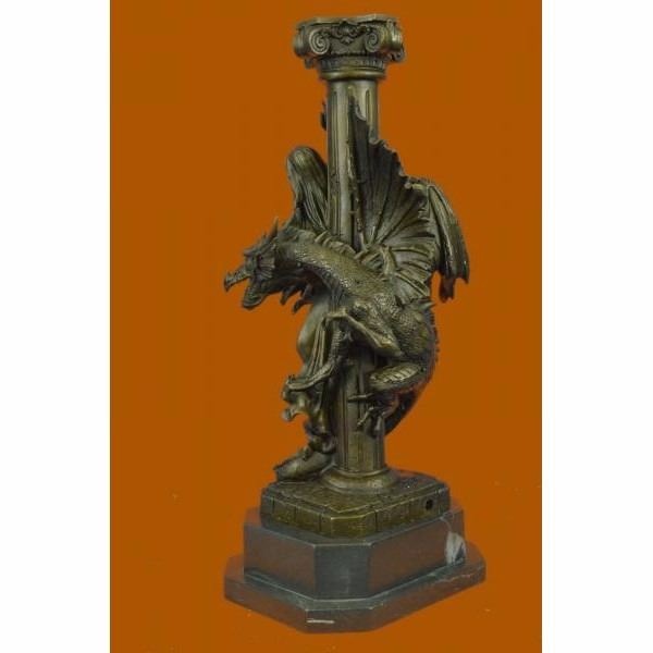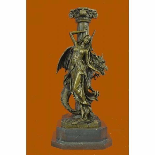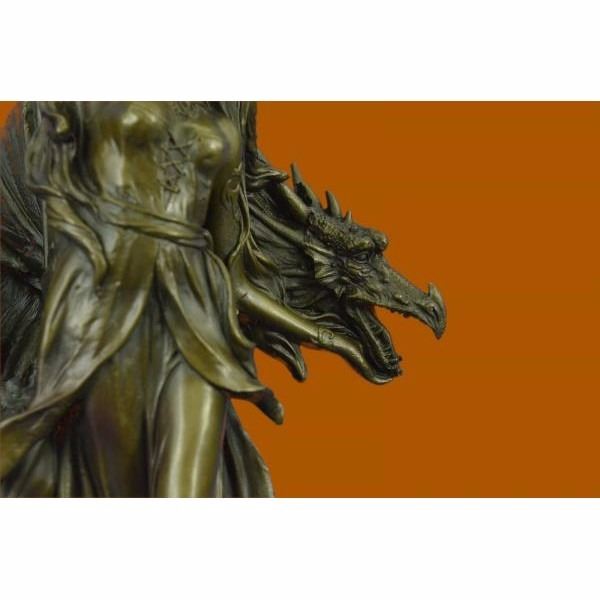 This sculpture is unbelievable in details. This astonishing woman stands on her toe, as a big dragon stand in back of her. She has the most amazing and sexy body for a female, you can see her flat stomach. She is wearing the most distinctive bikini top and like an Indian hand made bottom piece. The Dragon is very large and his mouth and fangs are out as if he is going attack anyone who comes close to the woman, its like her protector. She poses in front of her dragon pet without a care or worry in mind. This sculpture is handmade 100% bronze and is cast using the ancient Lost Wax Method in green patina and mounted atop a black marble base. Bronze Dimensions with Marble Base: Height 17 X Width 8 inches. Weight: 21 LBS. Please Note: This is a reproduction bronze sculpture from the original molded and signed. This featured bronze sculpture is a recast after the original, and has been done recently. This 100% bronze sculpture is an abstract piece certain to be a conversation piece.Please Note: This is a reproduction bronze sculpture from the original molded and signed. This featured bronze sculpture is a recast after the original, and has been done recently. This 100% bronze sculpture is an abstract piece certain to be a conversation piece.