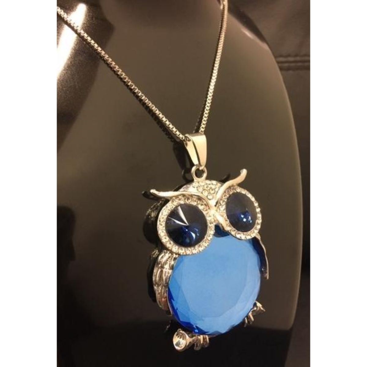 Semi Precious Blue Stone Owl Pendant Cuban 925 Silver Chain