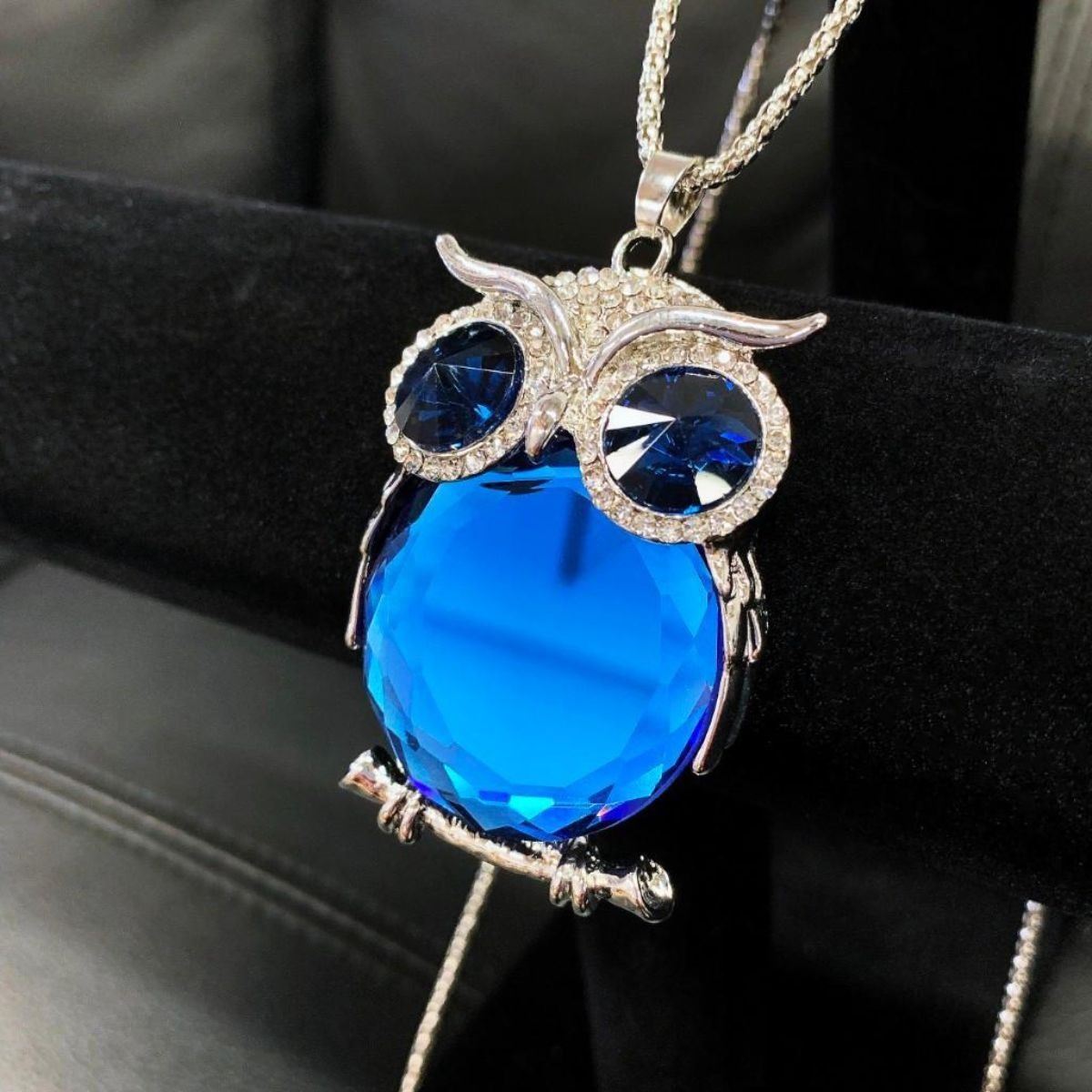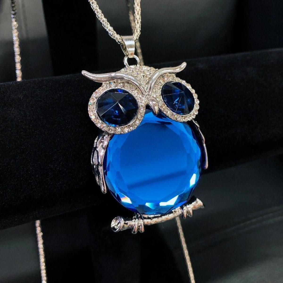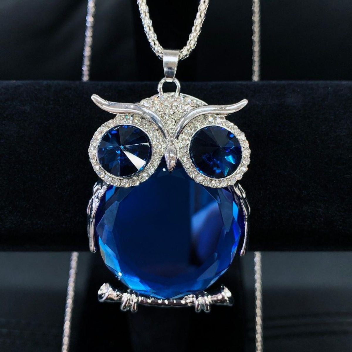 Semi-Precious Blue Stone Owl Pendant On Cuban Link Necklace. View Photos For Further Details.