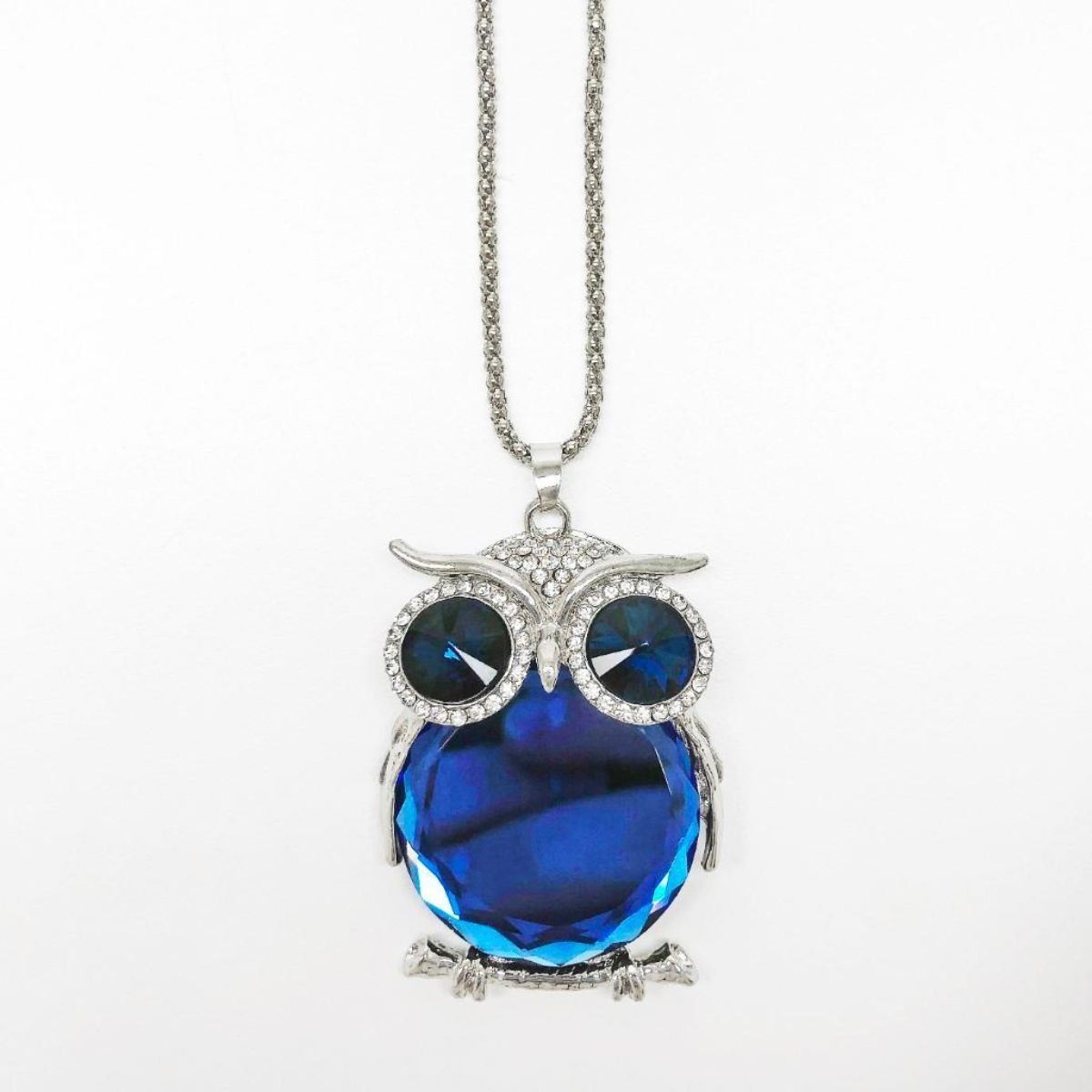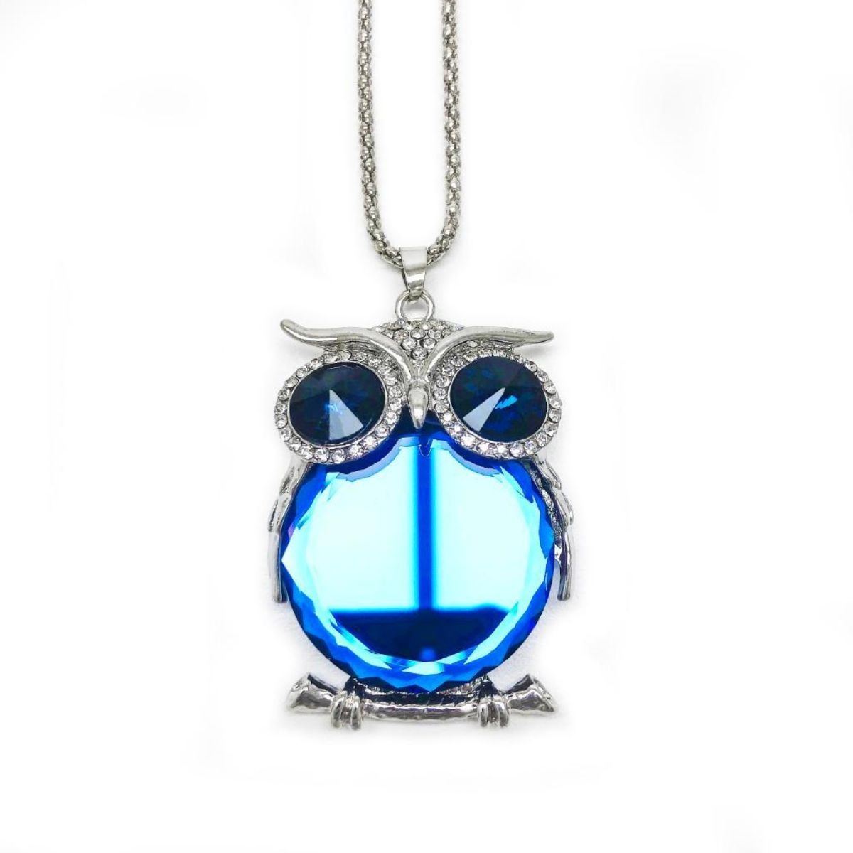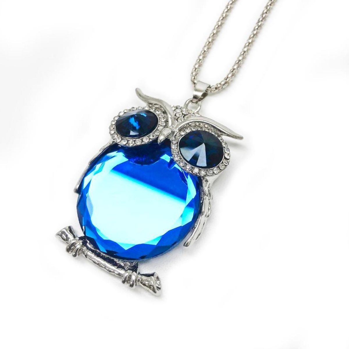 Semi-Precious Blue Stone Owl Pendant Cuban Chain.  The Owl Displayed Deep Blue Inset Stones For Eyes & Further Complimented By A Crystal Encrusted Hood As It Is Perched On The Silver Tone Branch. View Photos For Further Details