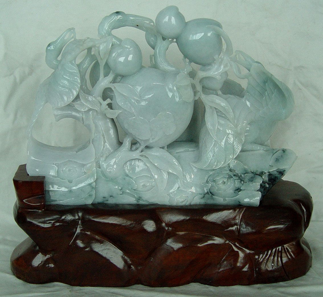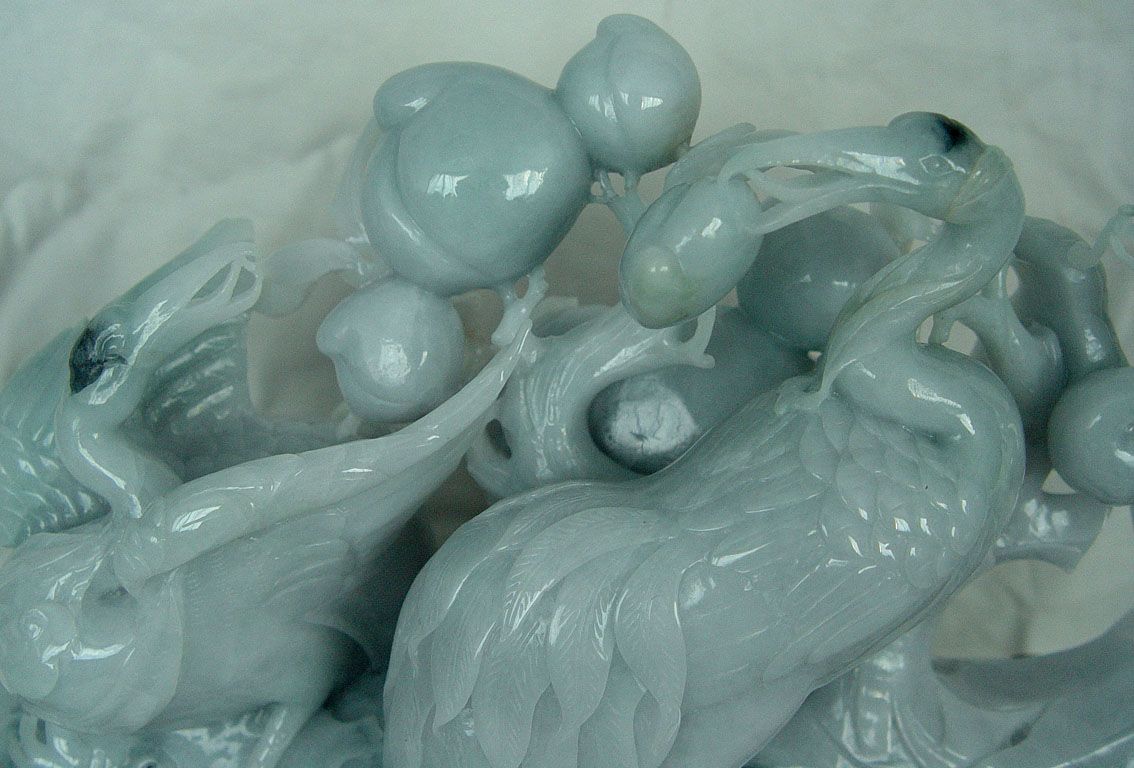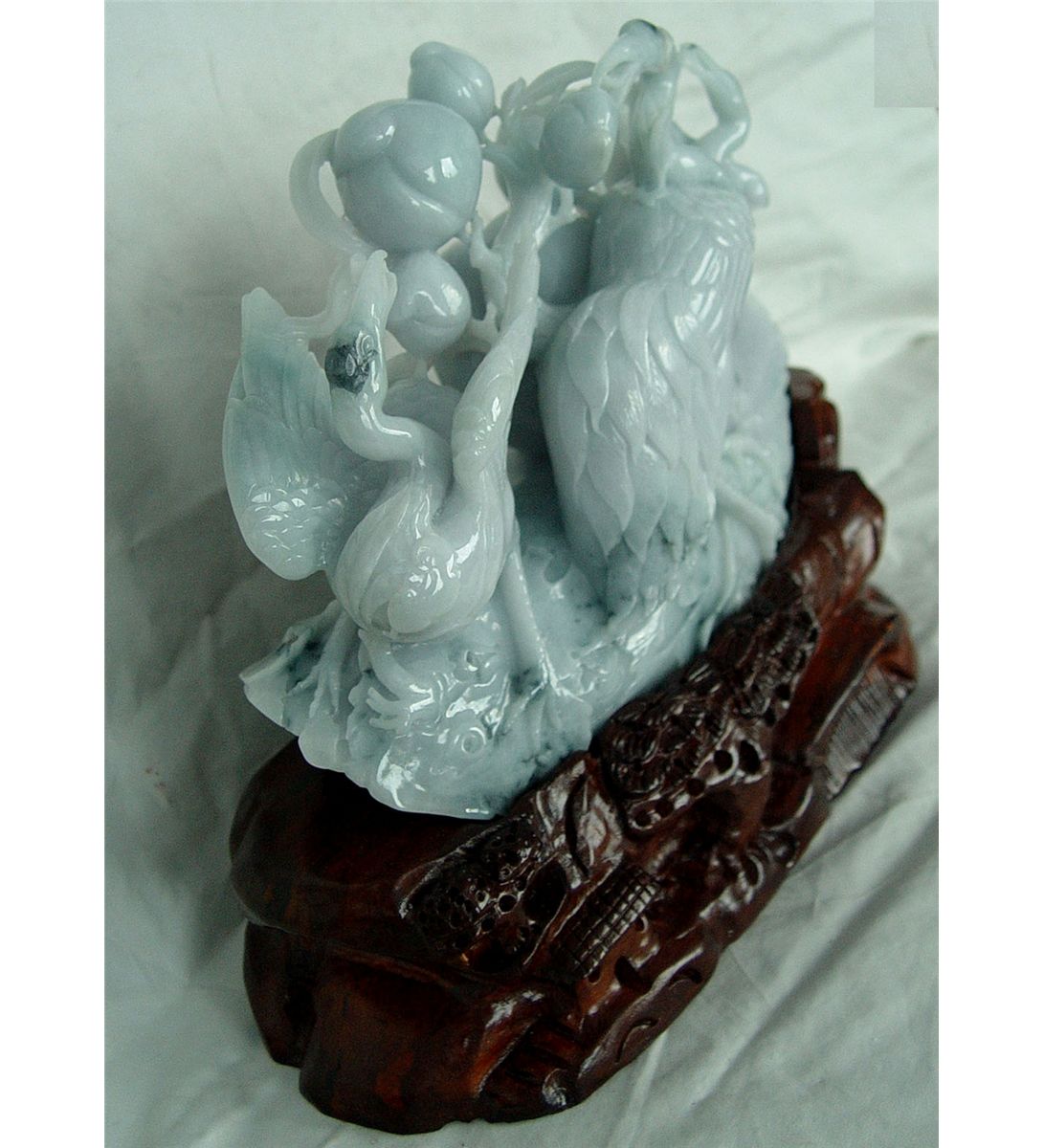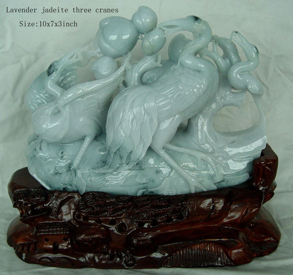Hand carved semi precious lavender jadeite Three Cranes on elegant hand carved wooden base. Jade size: 10" x 7" x 3"