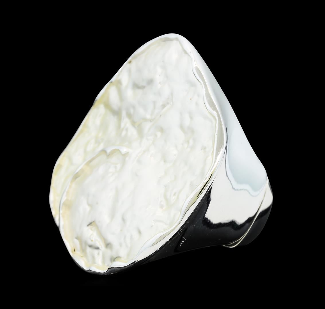 High end designer jewelry. Semi Round Medallion Ring - Rhodium Plated. Rhodium Plated Matte Metal. Silver. Elastic.