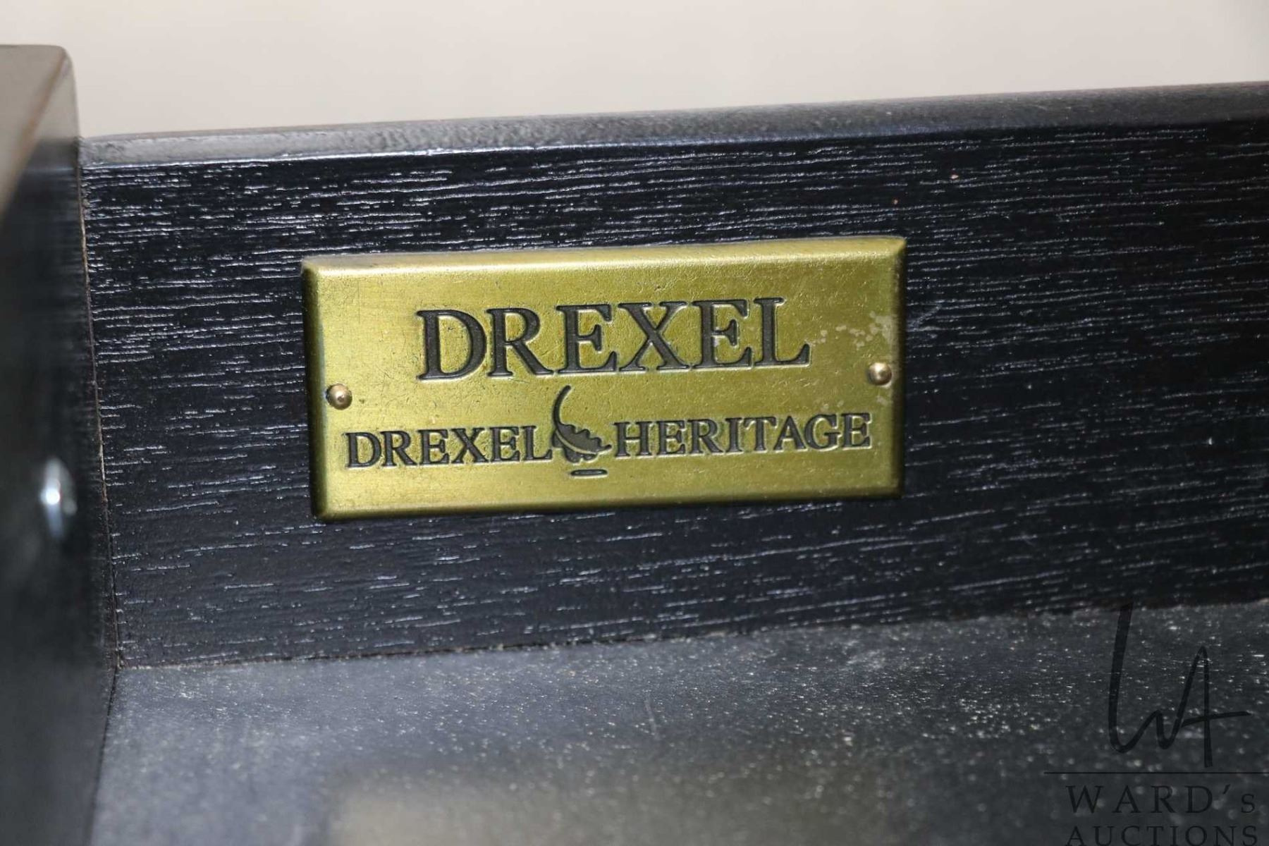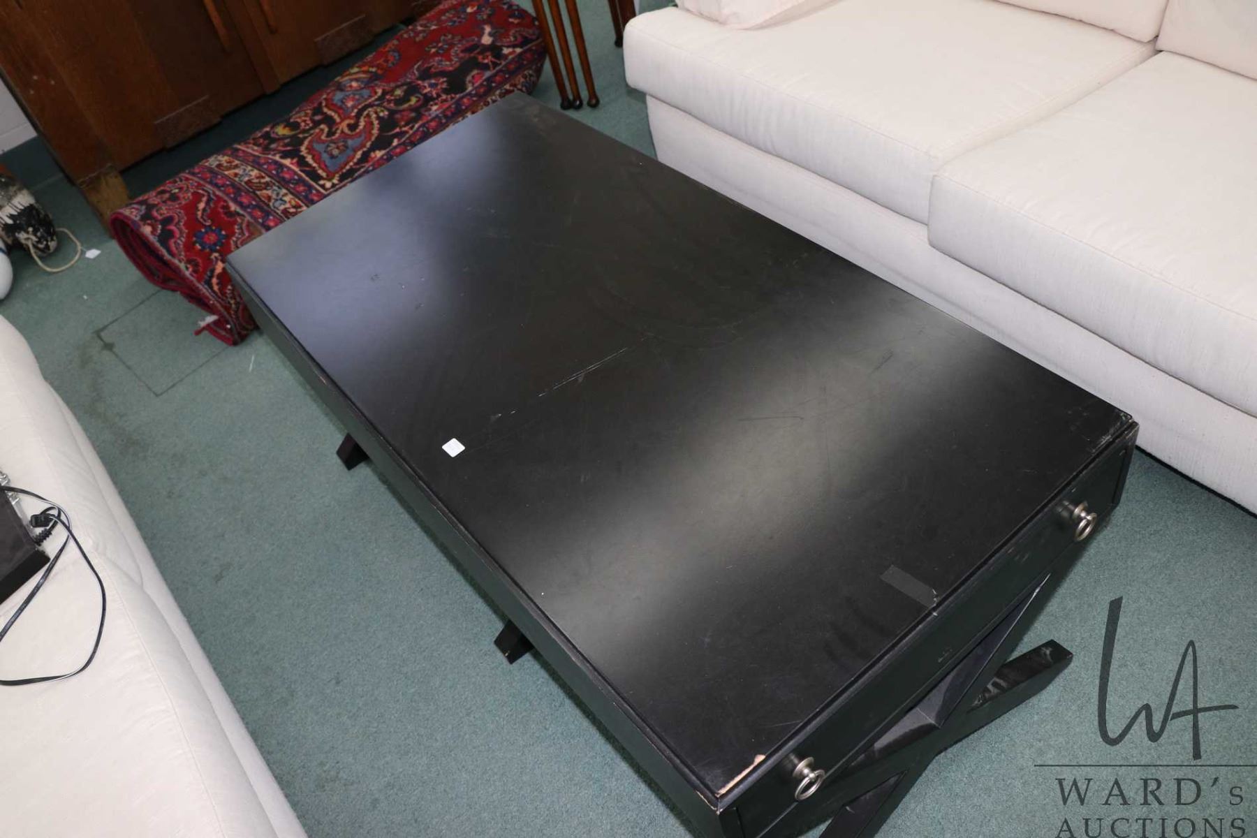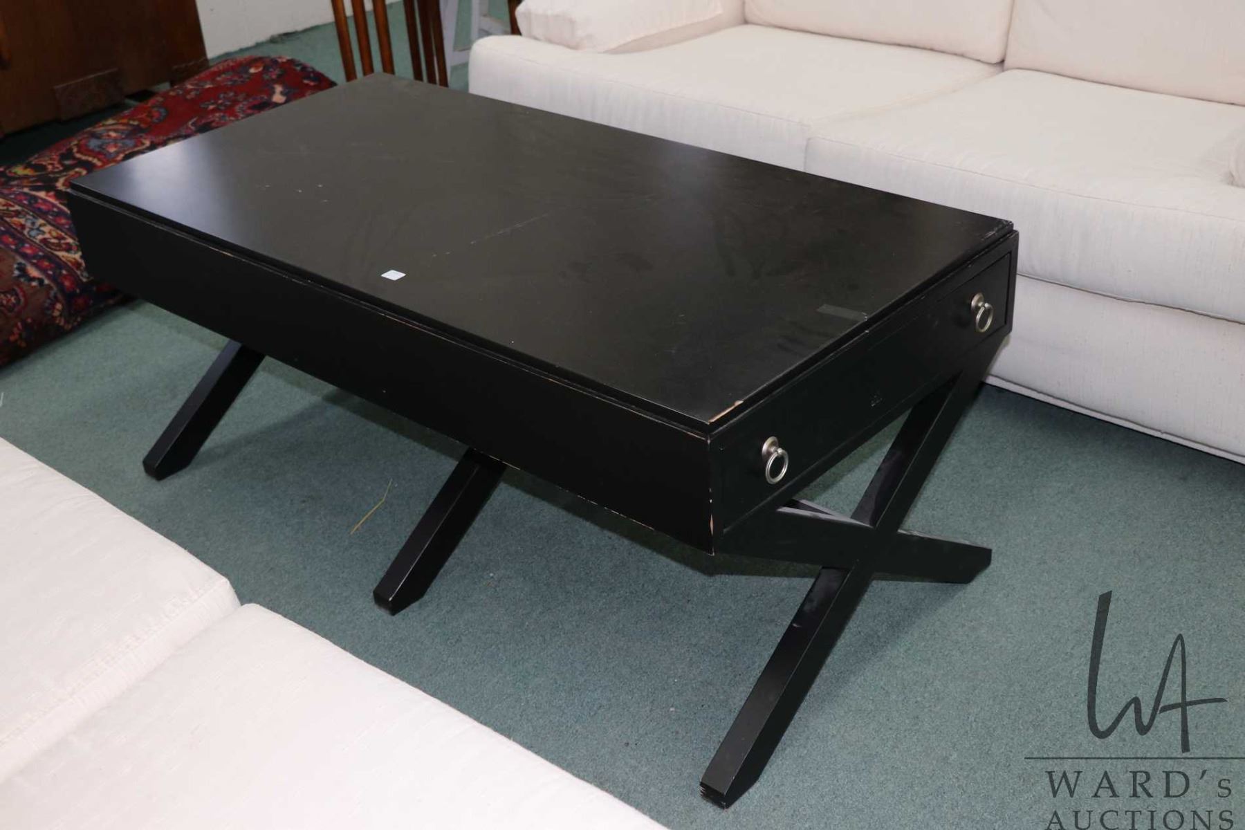 Semi contemporary black finish coffee table with single drawer on each end and cross supports, made by Drexel Heritage, 21" H X 24" X 48"