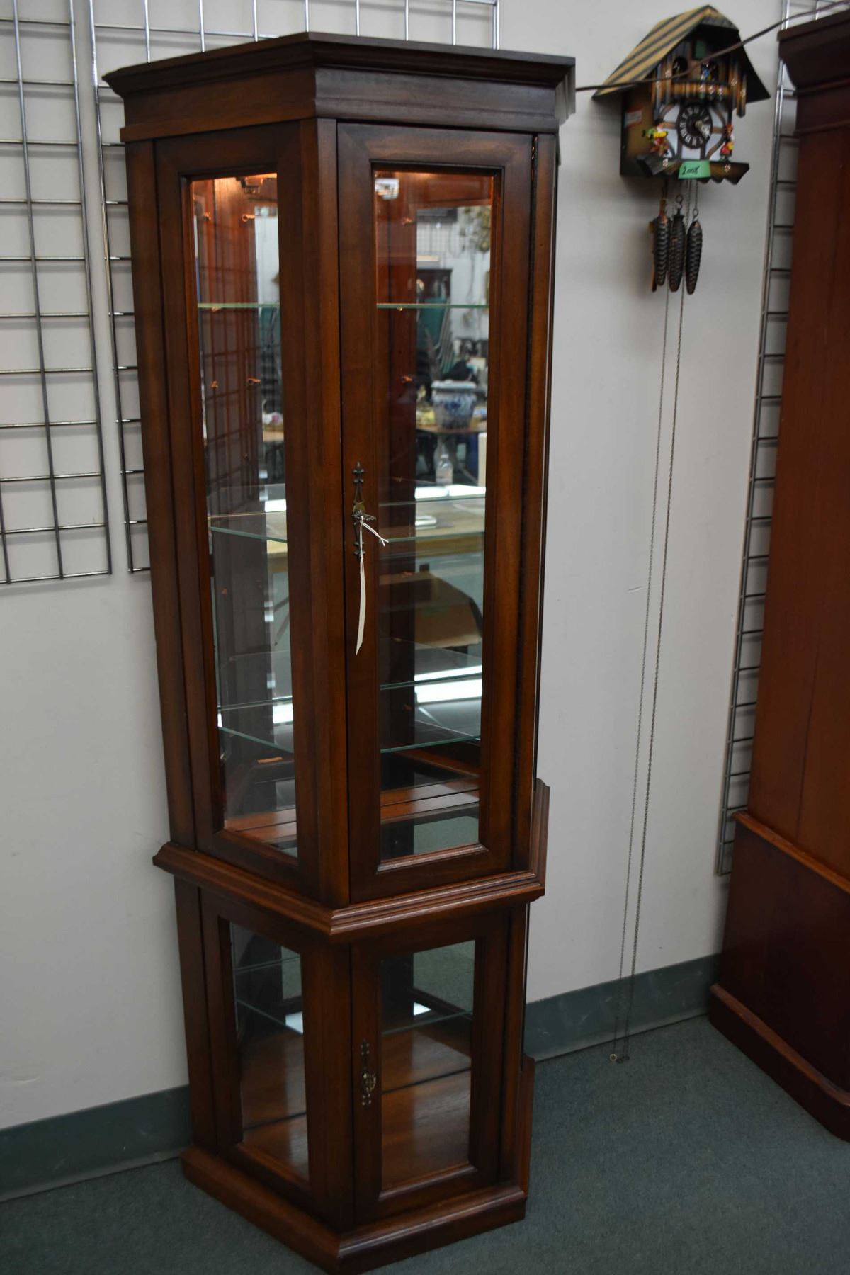 Semi-contemporary flat to the wall illuminated curio with glass shelves made by Strathroy
