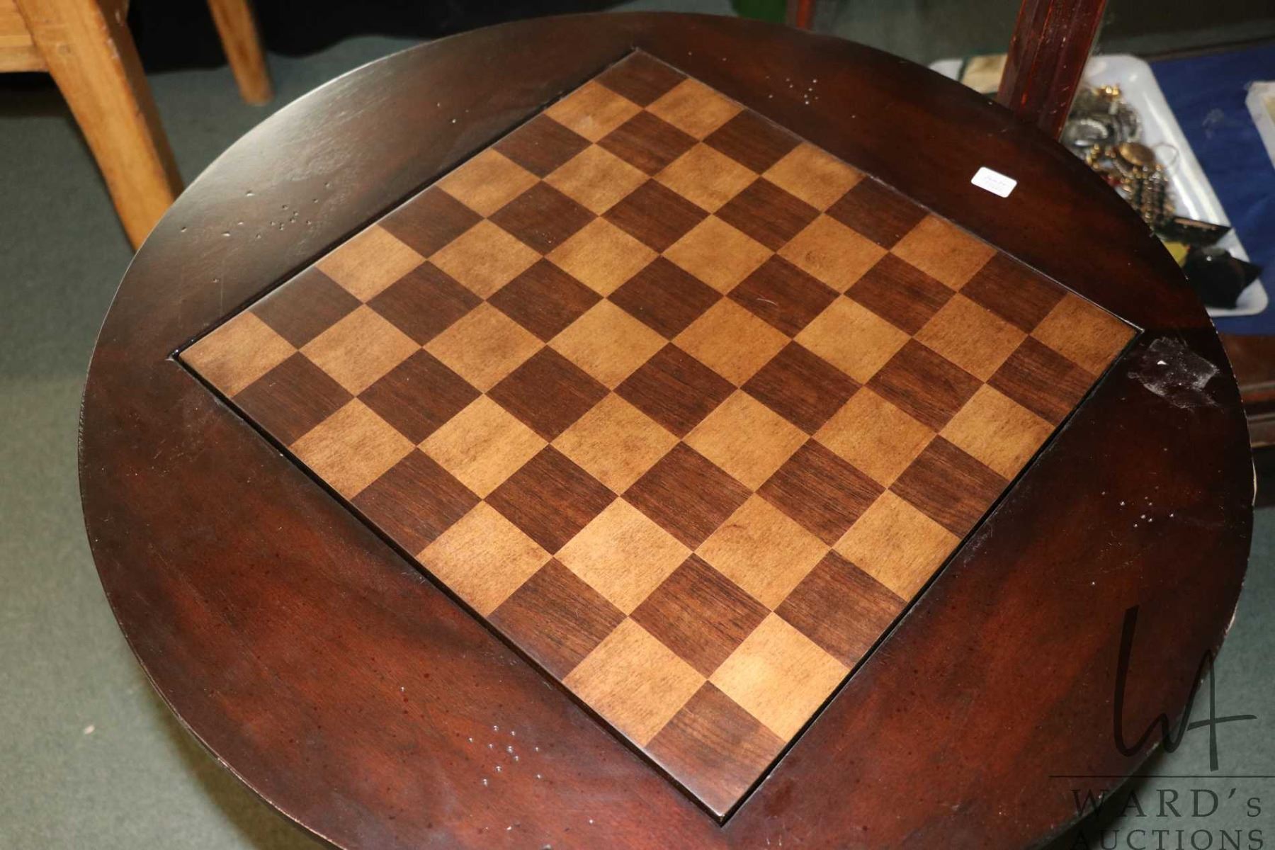 Semi-contemporary games table with foldover games board with chess/checkers and backgammon. 30" high 26" diameter