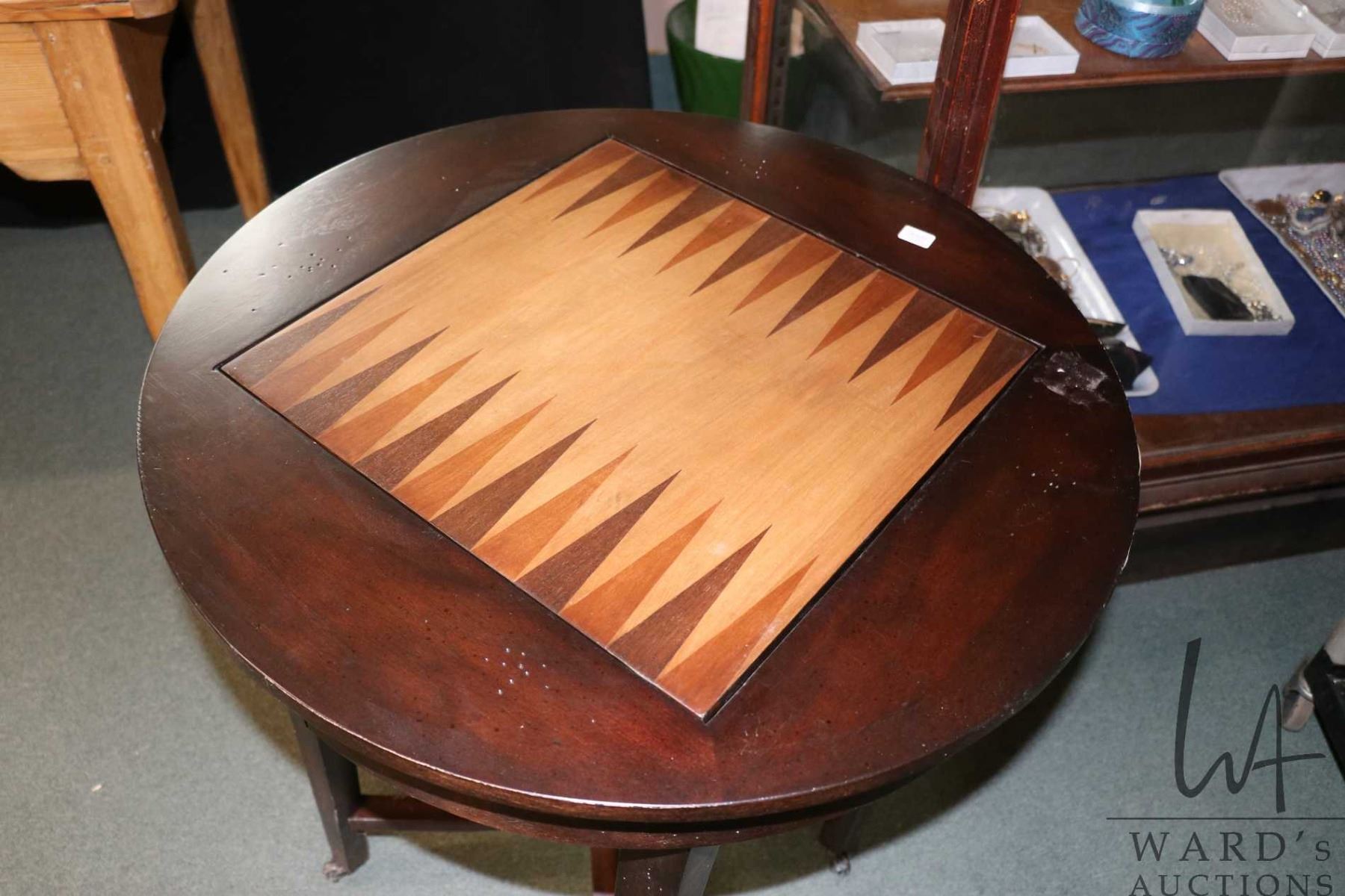 Semi-contemporary games table with foldover games board with chess/checkers and backgammon. 30" high