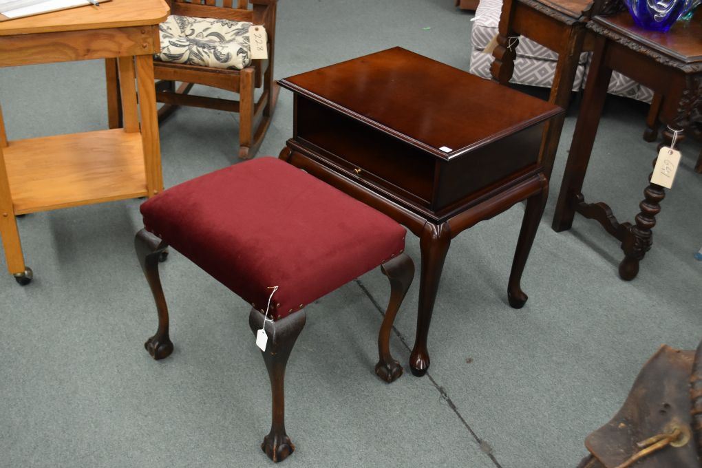 Semi contemporary side table with component storage and a mid 20th century stool on tall ball and claw supports