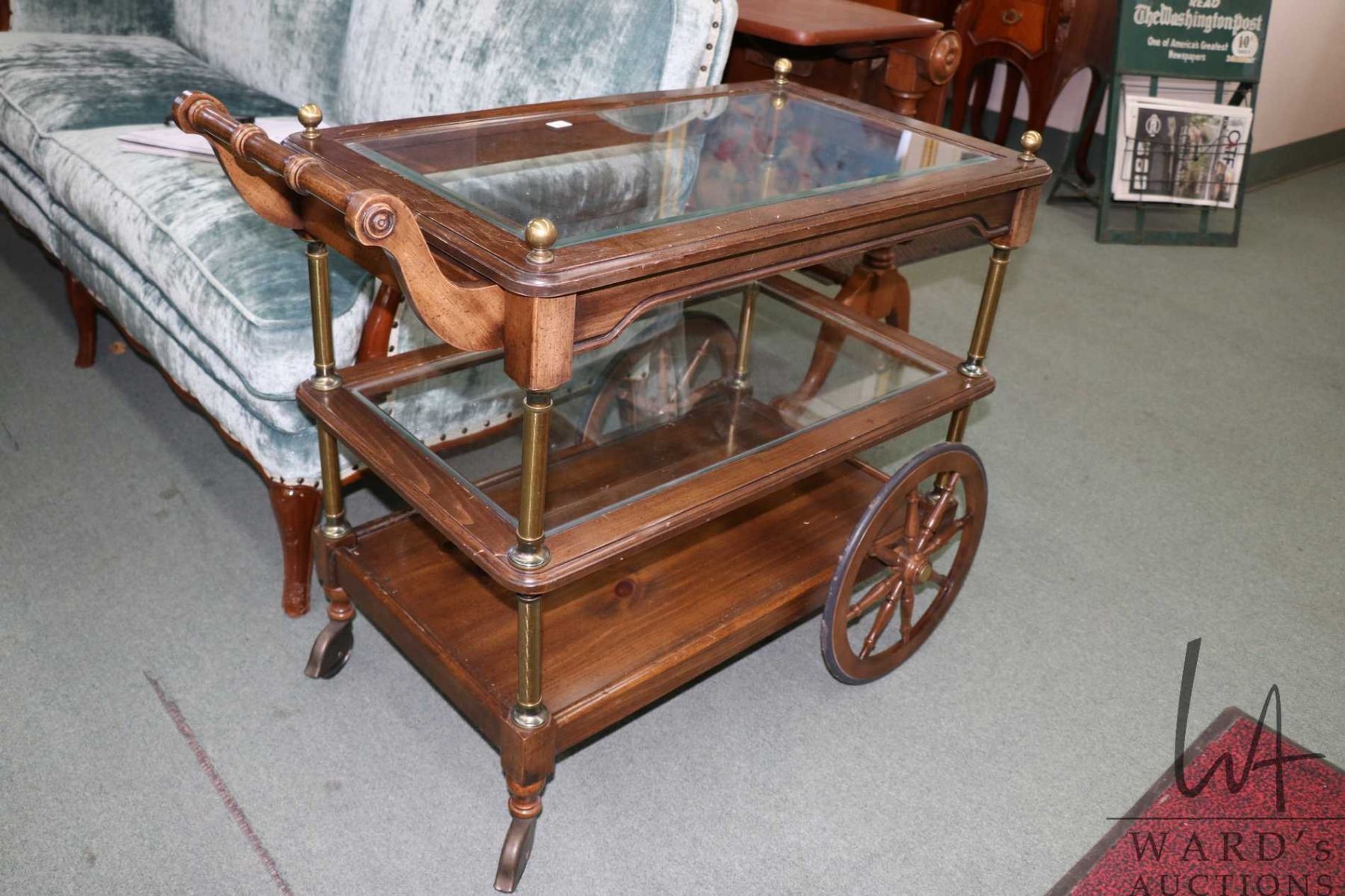 Semi contemporary tea trolley with glass shelves and fold down handle, 28" X 19" X 31"