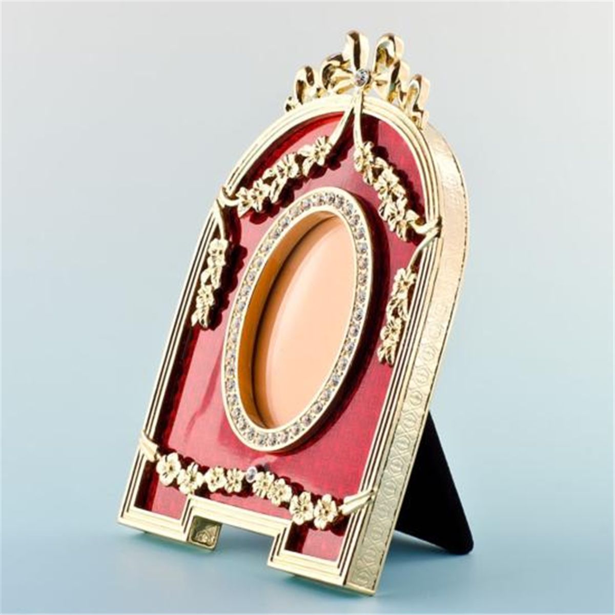 Semicircular Red Enamel Faberge Style Frame, Dimensions: 5in (H) X 3.5in (D), Materials Pewter, Enamel, Crystals.