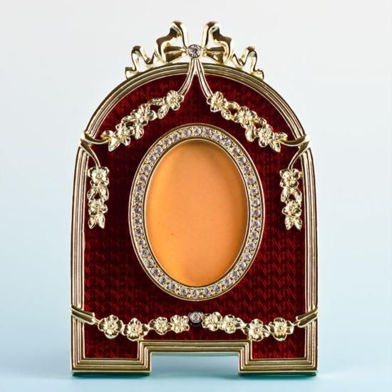 Semicircular Red Enamel Faberge Style Frame, Dimensions: 5in (H) X 3.5in (D), Materials Pewter, Enamel, Crystals.