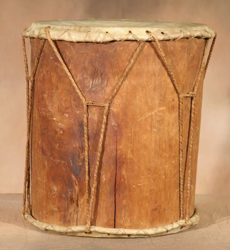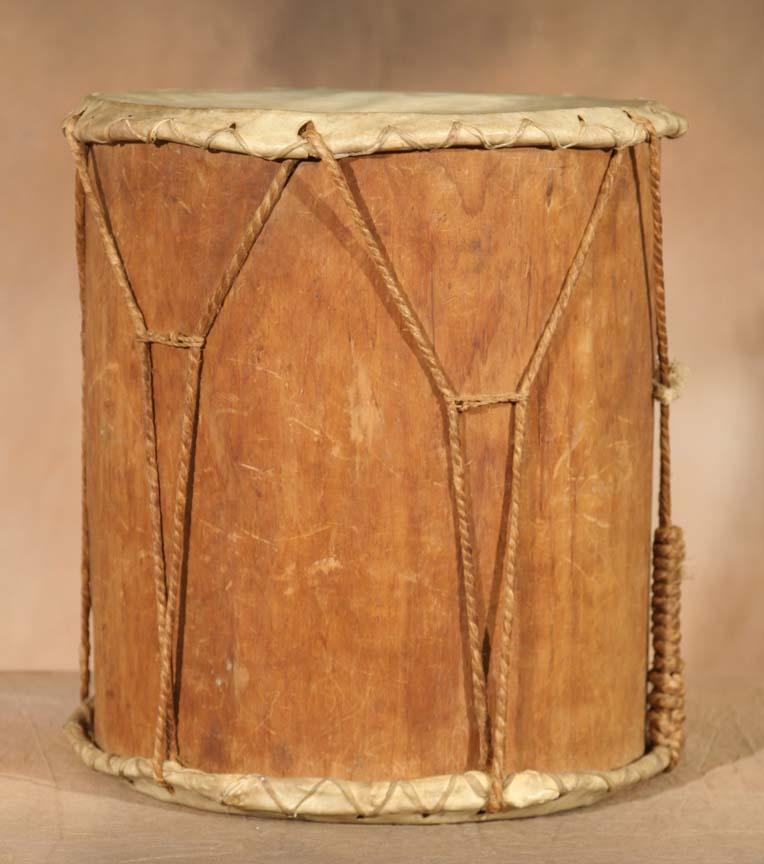 Seminole Drum. 15" x 13". Rawhide heads, rope tensioners over cypress . Circa 1880s. (est $1,500-2,500). For condition reports please visit: www.auctioninsantafe.com/cr2011.pdf
