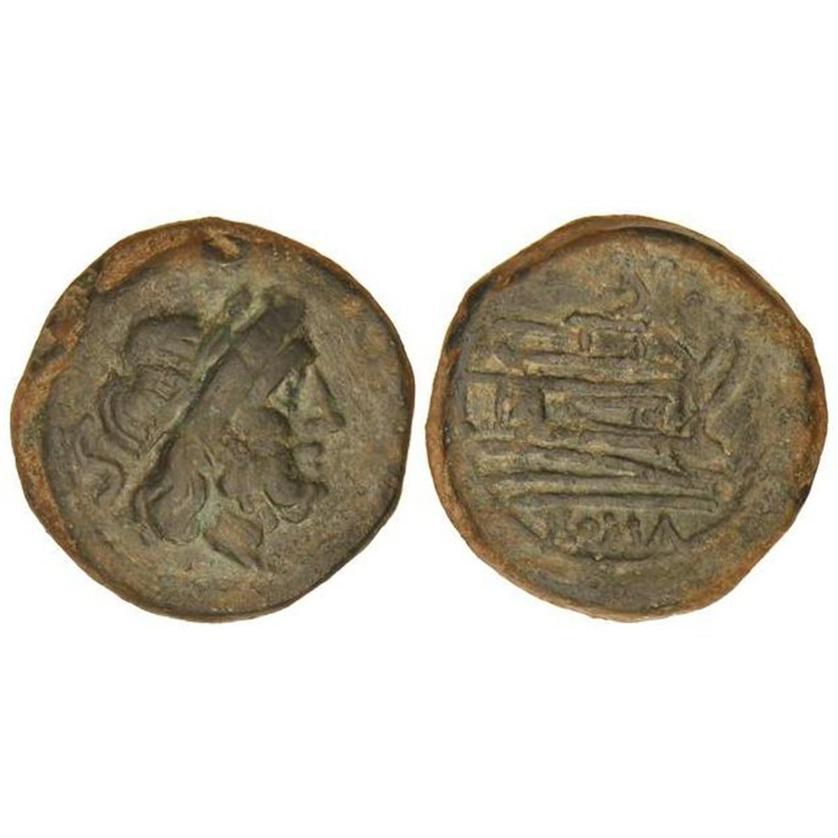 Semis. - 211-208 a.C. - ROMA. - Anv.: Cabeza de Saturno a derecha, detrás S. Rev.: Proa de nave a derecha, encima S, debajo ROMA. 21,68 grs. Se-766. MBC. - -
