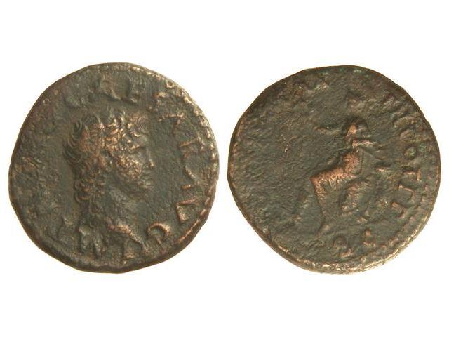 Semis. Acuñada el 54-68 d.c. NERÓN. Anv.: NERO CAESAR AVG. IMP. Cabeza laureada a derecha. Rev.: TR.POT. P. P. S. C. Roma sedente a izquierda, con guirnalda y coraza. (Pequeñas oxidaciones). C-332. MBC-.
