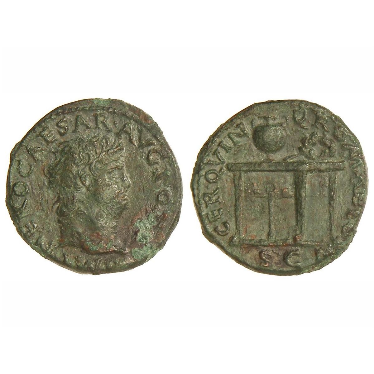 Semis. - Acuñada el 60 d.C. - NERÓN. - Anv.: IMP. CAESAR AVG. PONTIF. Cabeza descubierta a derecha. Rev.: CER. QVINQ. ROMAE. CON S. C. Mesa de juego ornada, encima jarra y corona. 5,50 grs. AE. Pátina verde. (Oxidaciones en anverso). C-57. MBC/MBC+. - -