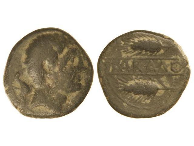 Semis. CARMO. Anv.: Cabeza masculina a derecha, detrás delfín. Rev.: Dos espigas a izquierda, entre ambas CARMO. 10 grs. Pátina verde. AB-461. MBC-.