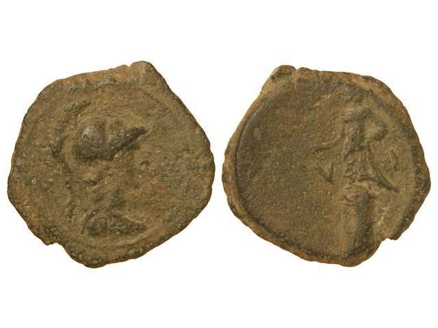 Semis. CARTAGONOVA. Anv.: Cabeza femenina con casco. Rev.: Estatua a los lados C.V.I.N. 6,40 grs. CU. Pátina verde. AB-751. MBC.
