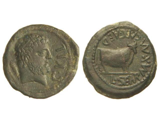 Semis. CELSE. Anv.: Cabeza barbada a derecha, detrás clava, delante C. VIL. Rev.: Toro a derecha, alrededor L. SEMP. MAX. M. CAEC. AED. 6,78 grs. ESCASA. AB-801. MBC+.