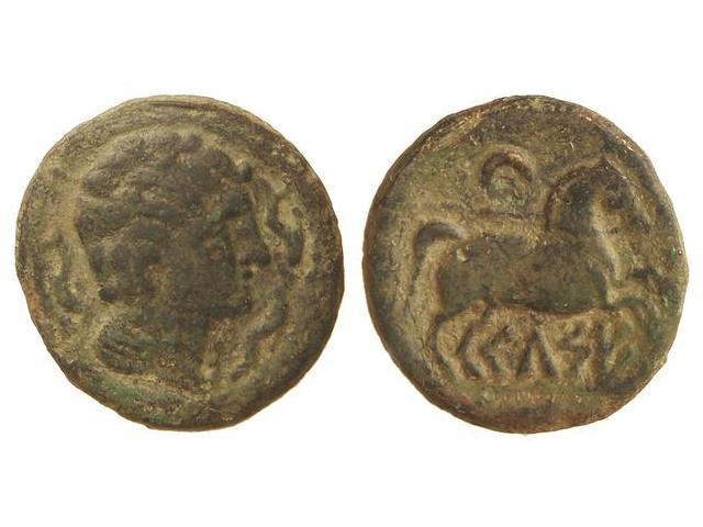 Semis. CELSE. Anv.: Cabeza masculina a derecha, rodeada de tres delfines. Rev.: Caballo a derecha entre creciente y leyenda ibérica. 5,80 grs. AE. AB-782. MBC.
