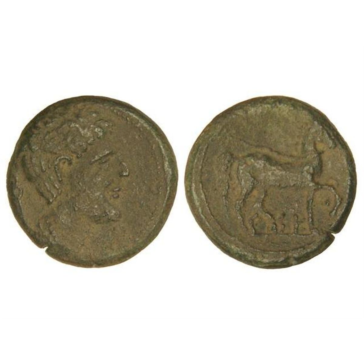 Semis. - CESE. - Anv.: Cabeza masculina a derecha, detrás caduceo. Rev.: Caballo a derecha, entre las patas delanteras punto, debajo sobre línea leyenda ibérica. 6,56 grs. Pátina verde. Vill-23. (MBC+). - -
