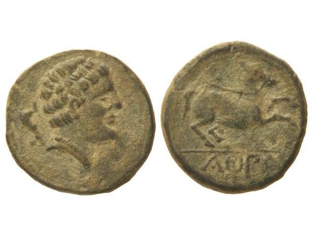 Semis. CONTERBIA CARBICA. Anv.: Cabeza masculina a derecha, detrás delfín. Rev.: Caballo galopando a derecha, debajo leyenda ibérica. 4,84 grs. Pátina verde. AB-855; Vill-8. MBC+.