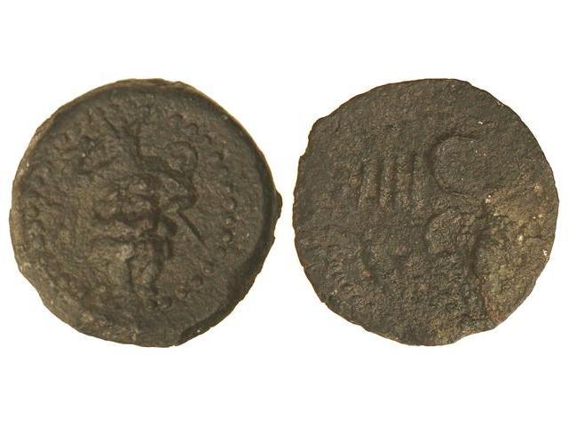 Semis. - EBUSUS. - Anv.: Bes con maza y serpiente, a izquierda letra fenicia shin. Rev.: Leyenda fenicia. 6,70 grs. Pátina oscura. (Oxidaciones). AB-955; Vill-49. MBC/MBC-. - -