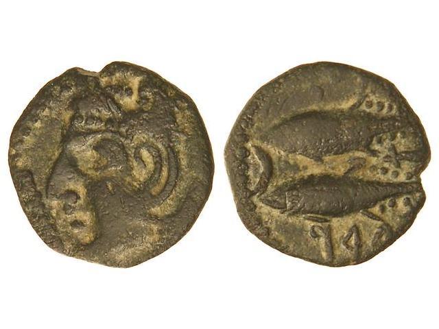 Semis. GADES. Anv.: Cabeza de Hércules con piel de león a izquierda, delante clava. Rev.: Dos atunes a izquierda encima y debajo leyenda púnica, entre ambos creciente y punto y letra púnica. 3,30 grs. Pátina negra. AB-1347. MBC.