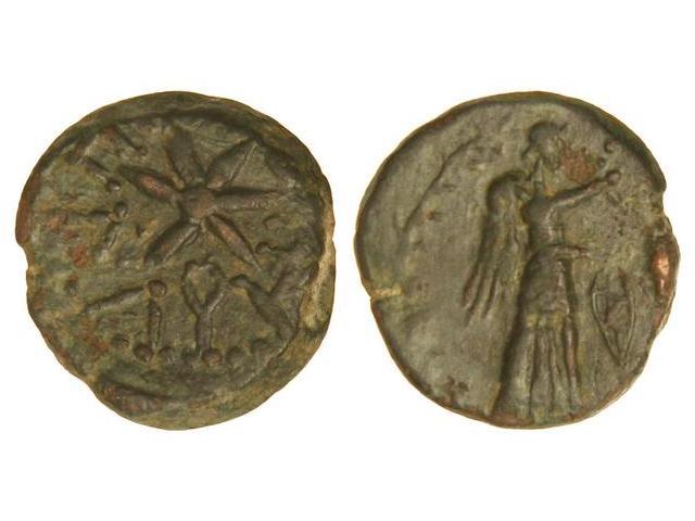 Semis. ILIBERRI. Anv.: Estrella y (creciente). ILDVRIR. Rev.: Victoria con escudo a derecha, delante punta de lanza. 4,10 grs. Pátina verde. MUY RARA. AB-1509. MBC+.