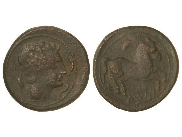 Semis. - ILTIRTA. - Anv.: Cabeza masculina a derecha, rodeada por tres delfines. Rev.: Caballo a derecha, encima creciente, debajo leyenda ibérica. 8,80 grs. AB-1466; Vill-26 var. BC+/MBC-. - -