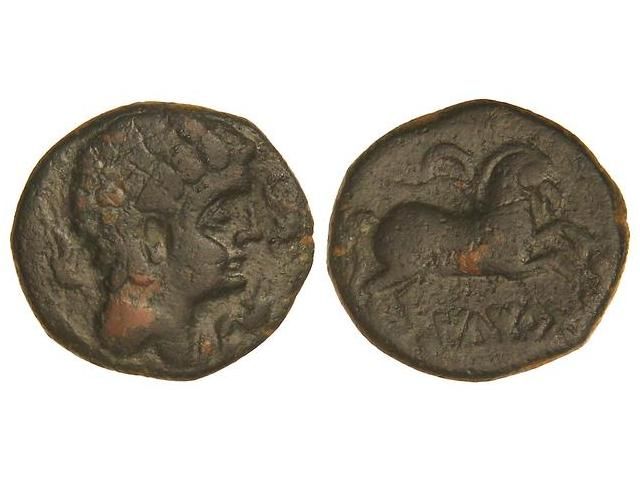 Semis. ILTIRTA. Anv.: Cabeza masculina a derecha rodeada por tres delfines. Rev.: Caballo a derecha, encima creciente, debajo leyenda ibérica. 5,66 grs. Pátina oscura. AB-1472; Vill-23. MBC/MBC-.