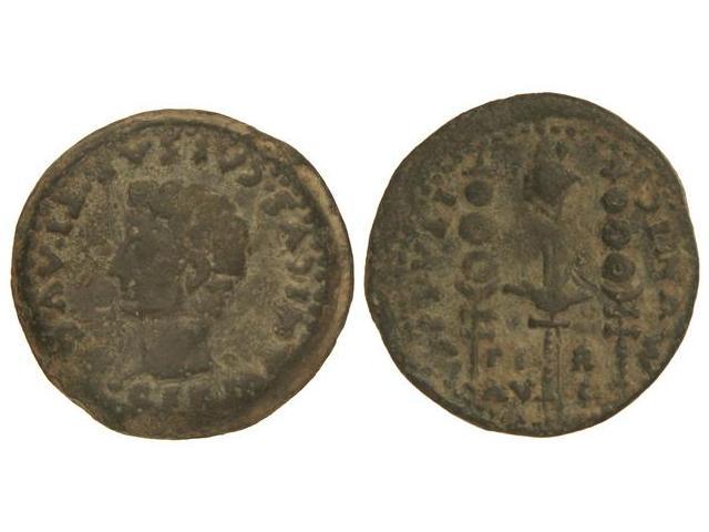 Semis. - ITALICA. - Anv.: GERMANICVS CAESAR TI. AVG. F. R. Cabeza de Germánico a izquierda. Rev.: MVNIC. ITALIC. PER. AVG. Enseñas y águila legionaria. 11,30 grs. Pátina verde. AB-1596. MBC/MBC-. - -
