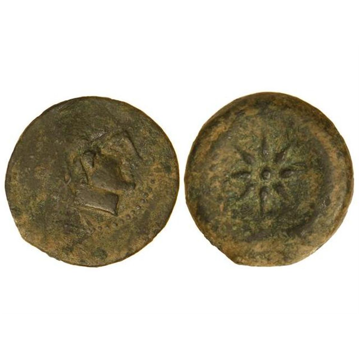 Semis. - MALACA. - Anv.: Cabeza de Vulcano a derecha con birrete plano, detrás tenazas. Rev.: Estrella de ocho rayos. 9,70 grs. Pátina verde. AB-1733. MBC-/MBC. - -