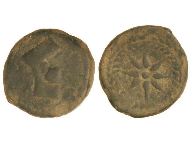 Semis. MALACA. Anv.: Cabeza de Vulcano a derecha con gorro plano, detrás leyenda neopúnica y tenazas. Rev.: Estrella de ocho puntas. 8,10 grs. Variante por el pequeño tamaño de las tenazas. Pátina verde oscura. AB-1733 var.; G.G.-57. BC+/MBC-.